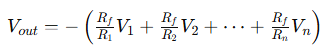 この回路は反転増幅回路を応用したもので、入力が複数になった構成です。