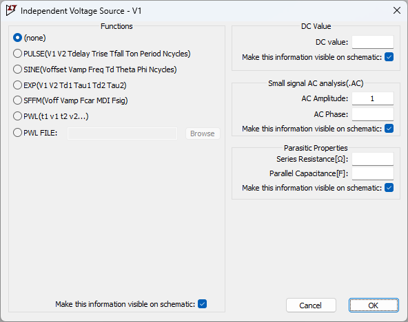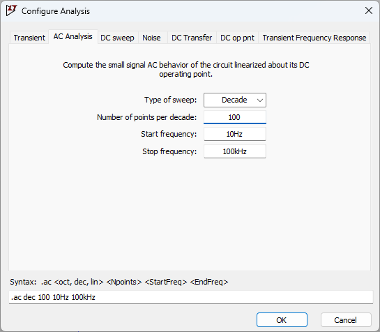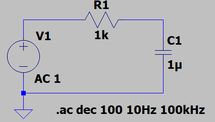 AC解析では、電源に「AC = 1」を設定する必要があります。